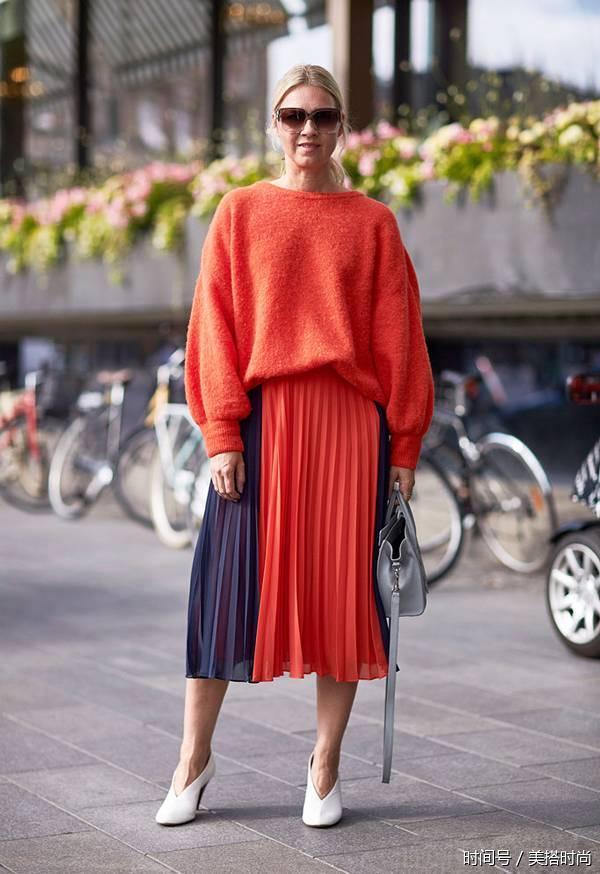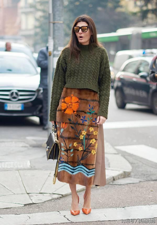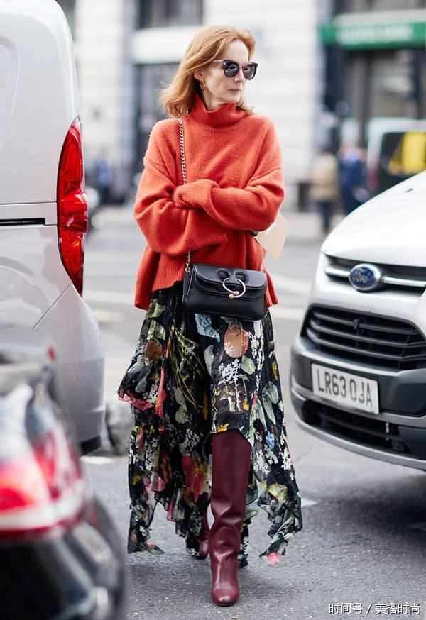 用一件高領(lǐng)大毛衣搭配最近很火的印花裙既有英式的俊朗,也有法式的優(yōu)雅。
