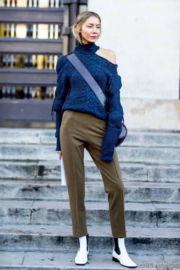高領(lǐng)露肩毛衣也是一個(gè)搭配小心機(jī),在臃腫的羽絨服或者外套之中小露香肩的毛衣更是出街致勝法寶。